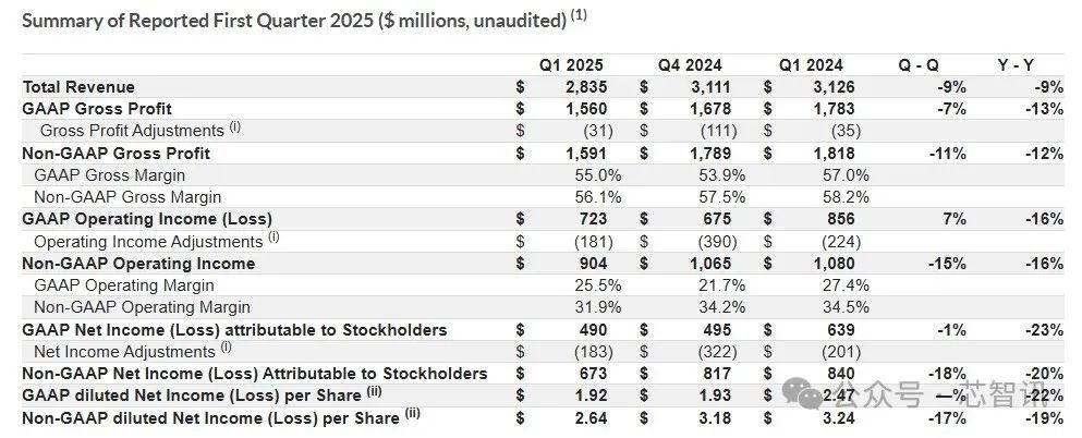 具体来说,恩智浦一季度营收为28.35亿美元,同比和环比均下滑了9%,但仍略高于分析师预期的28.3亿美元;依照一般公认会计原则(GAAP)毛利率为 55.0%,GAAP 营业利润率为 25.5%,GAAP每股收益为1.92 美元。