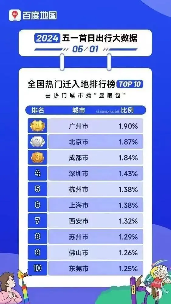 ▲5月1日,百度地图发布2024“五一”假期首日出行大数据。数据显示,广州位列全国热门迁入地排行榜TOP1。(图片来源:百度地图、广州广播电视台)