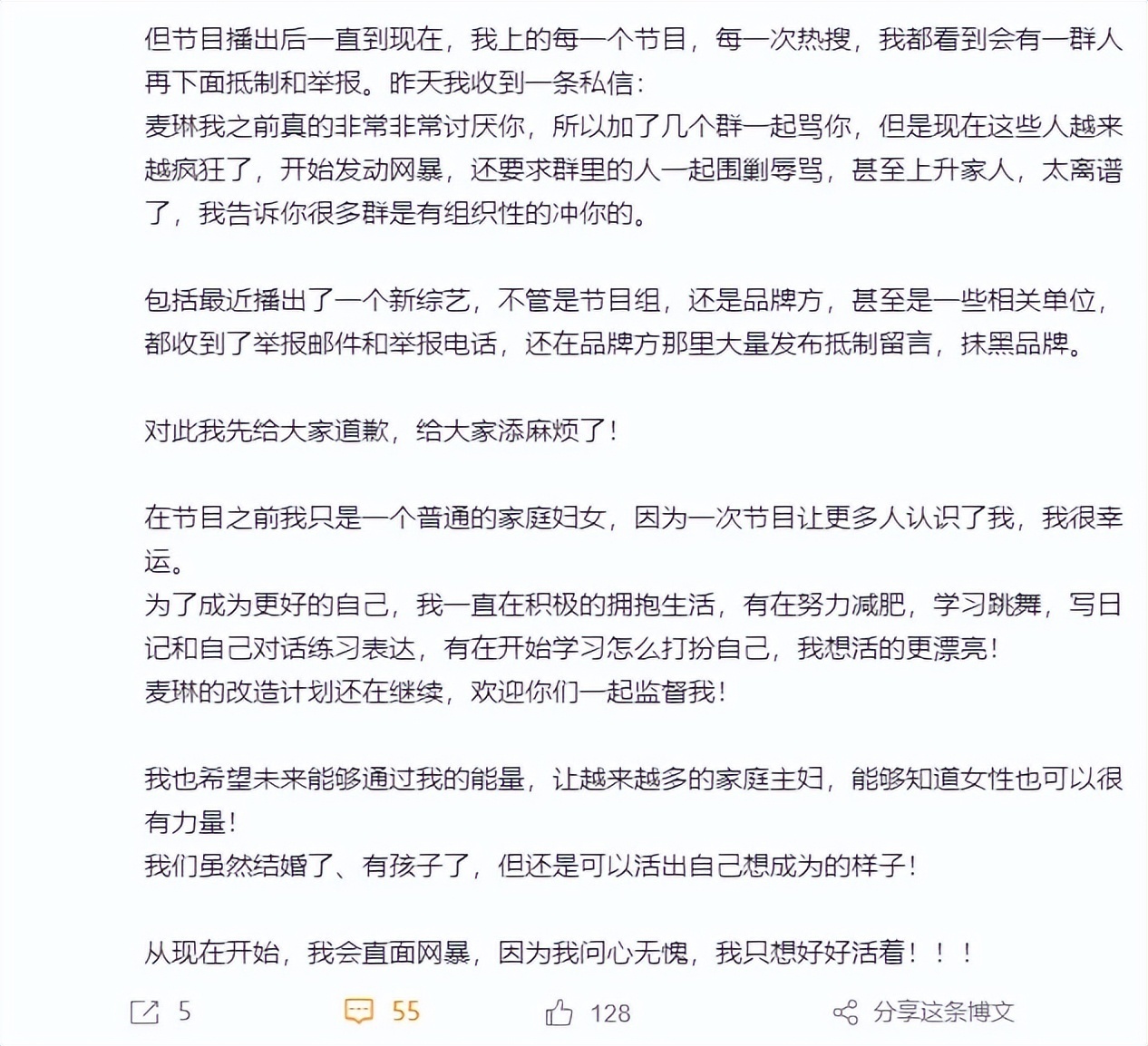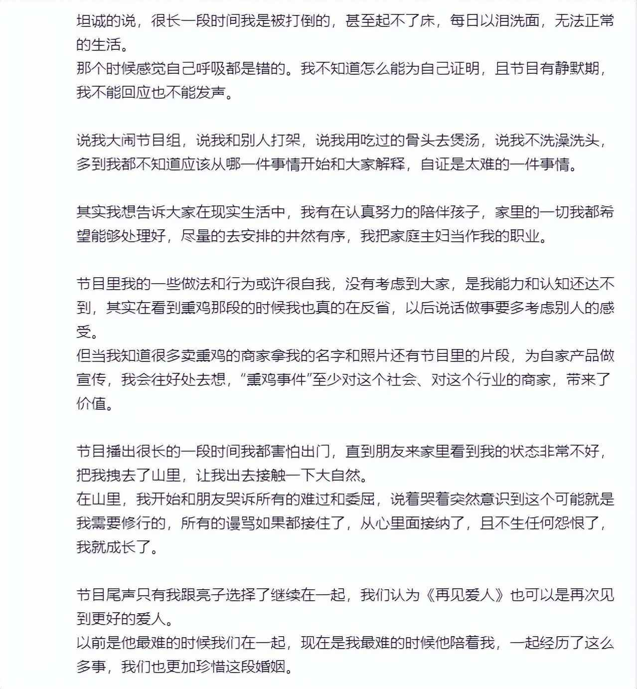 其还称,节目播出后自己遭到了很多无端的指责与谩骂,“会直面网暴,我问心无愧,只想好好活着”。