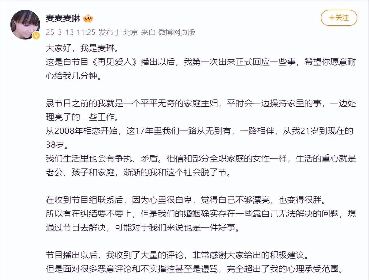3月13日,麦琳在社交平台发长文回应争议。