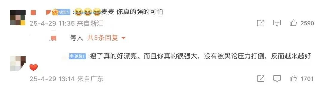 有网友感叹“真的瘦若两人”“麦麦,你真的强得可怕”“执行力这么强,做什么都会成功的。”