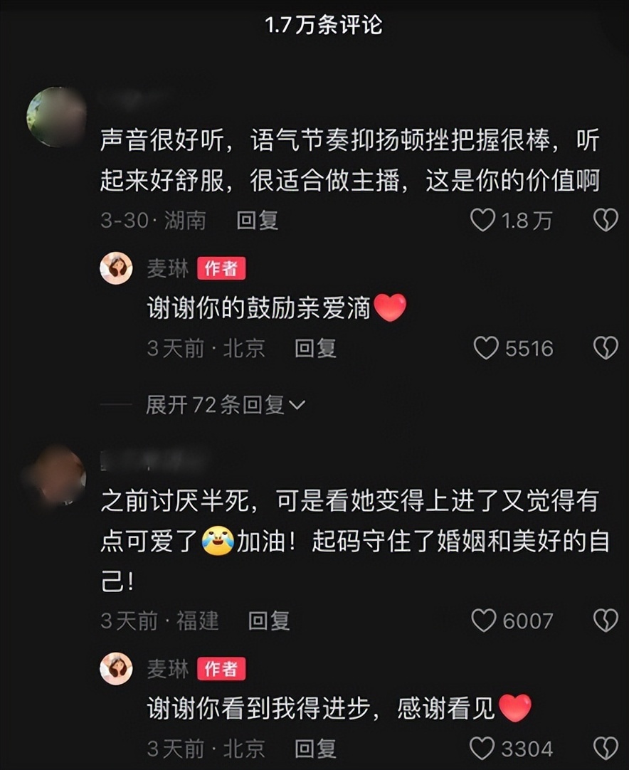 视频发布后引发网友热议,出稿前点赞量近48万,热评区有网友夸赞麦琳变得上进又可爱,她火速回复:“谢谢你看到我的进步。”