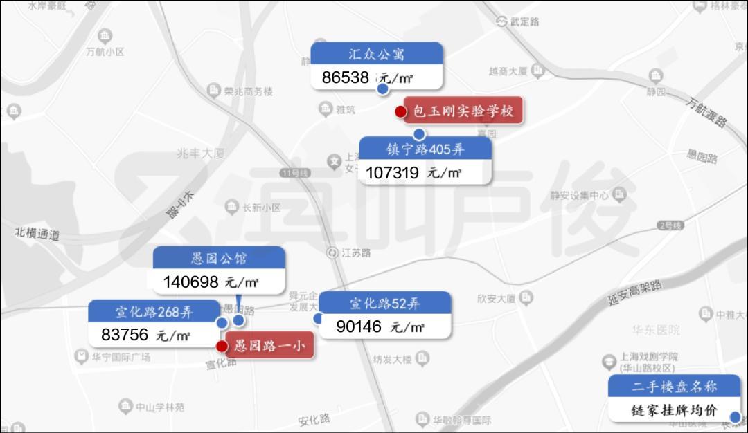 愚园路一小的对口小区,即使是老破小单价也在10万元/㎡左右,而包玉刚实验学校周边老小区则很难卖到10万/㎡以上。这些小区的业主与走国际路线的学生家长不是同一客群,也很难带动周边房价的增长。