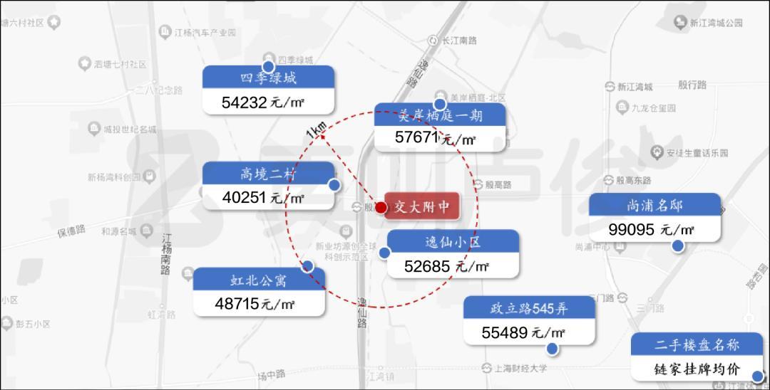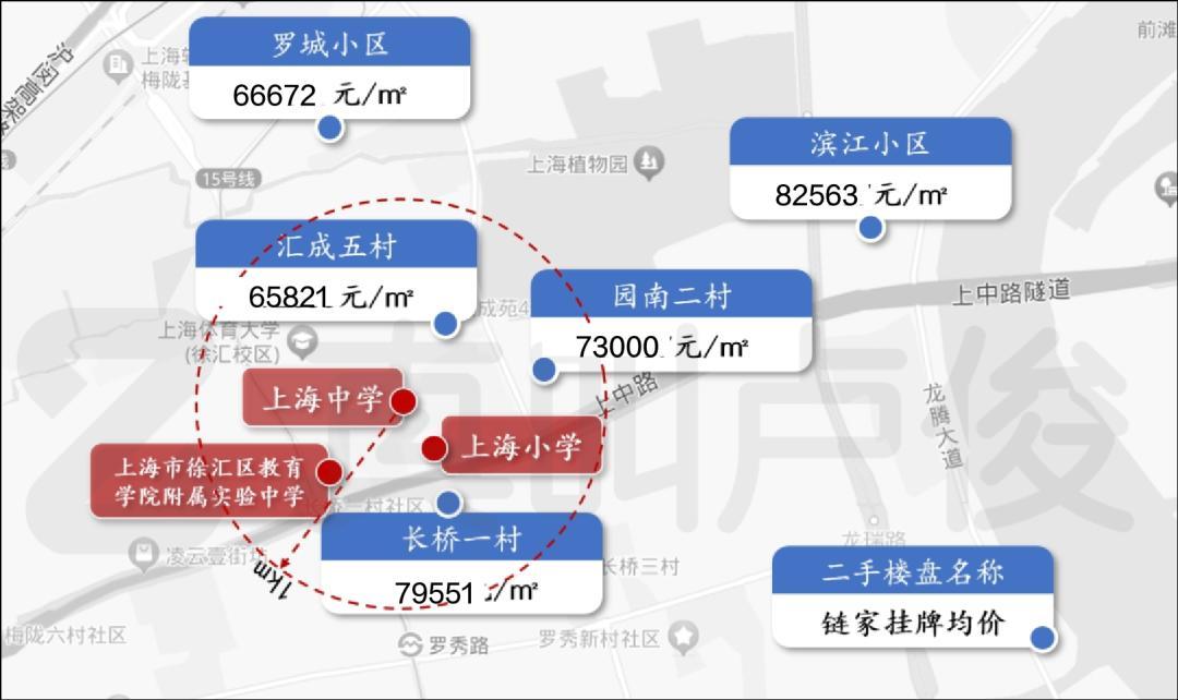 但仔细研究就会发现,上海中学旁边部分小区属于“上海小学+徐汇区教育学院附属实验中学”的双学区。而不是好学区的小区价格并没有什么优势。最终给小区房价带来提升的还是公办义务教育阶段的学校。交大附中周边没有优质公办初中小学,更能反映好高中对房价的影响。