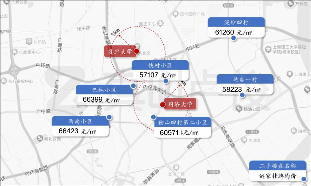 买在旁边对入学几乎没有半点影响,想要读名校还得靠鸡娃。我们也看了一下复旦大学(邯郸校区)和同济大学(四平路校区)所在的中原板块和旁边的曲阳板块。