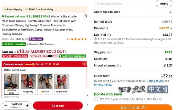 例如,在Temu的“畅销品”专区,一款标价13.2美元的女式凉鞋在美国加利福尼亚州购买时,除了1美元的销售税外,还需加收18.3美元的进口费用,最终价格为32.5美元,约为原价的2.5倍。