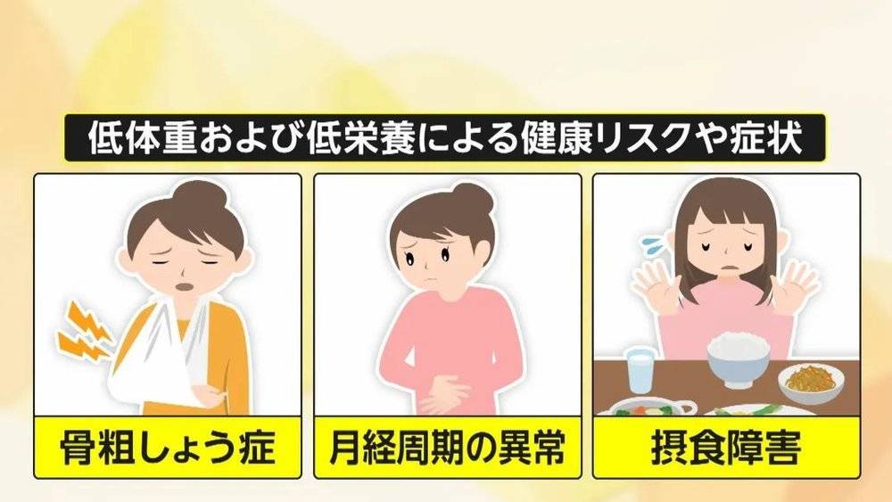 2019年,日本20岁女性的平均每日热量摄入仅为1600千卡,低于战后粮食短缺时期的1696千卡,也远低于厚生劳动省推荐的1950千卡。2015年的一项调查估计,日本高中女生的厌食症患病率在0.09%至0.43%之间,正在成为不容忽视的青少年健康问题。