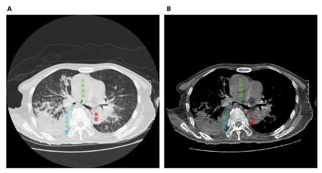 原本该走进消化道这个“热带雨林”被消化掉的紫米粥,似乎迷了路,穿越到本来与消化道不相往来的呼吸道,这到底发生了什么?为了明确病因,患者完善了肺部CT,发现食管与支气管之间开放了异常通道——出现了支气管食管瘘,并且继发了严重的肺部感染。