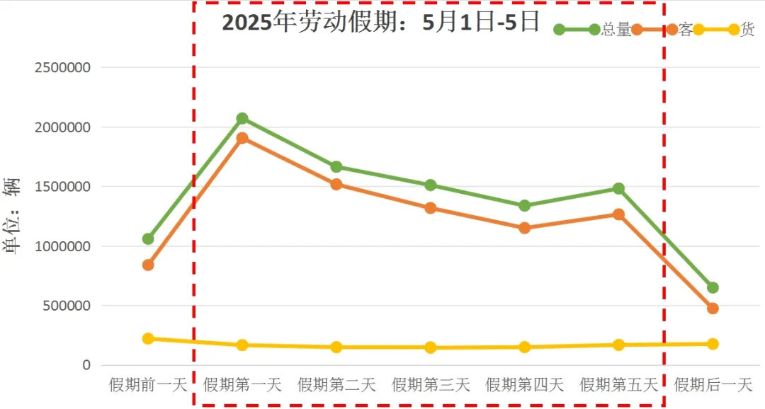 公路方面,“五一”期间,我省高速公路车型流量以中短途的小客车自驾出行为主,占比90.28%。客车流量变化表现为,假期首日达到最高峰后,次日开始阶梯式递减,第五日略有反弹但幅度有限。从整体来看,“五一”期间公众返乡探亲、旅游出行需求进一步集中释放,叠加物资运输、休闲购物等出行活动,全省高速公路交通流量持续高位运行,部分路段通行压力显著增加。此外,跨省出行、跨区域流动也会有所增强,跨省通道及省内高速车流量高于往年同期。