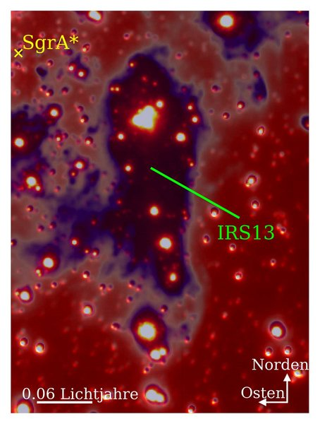 IRS13的图像,在银河系中心的超大质量黑洞周围有大量的年轻恒星。