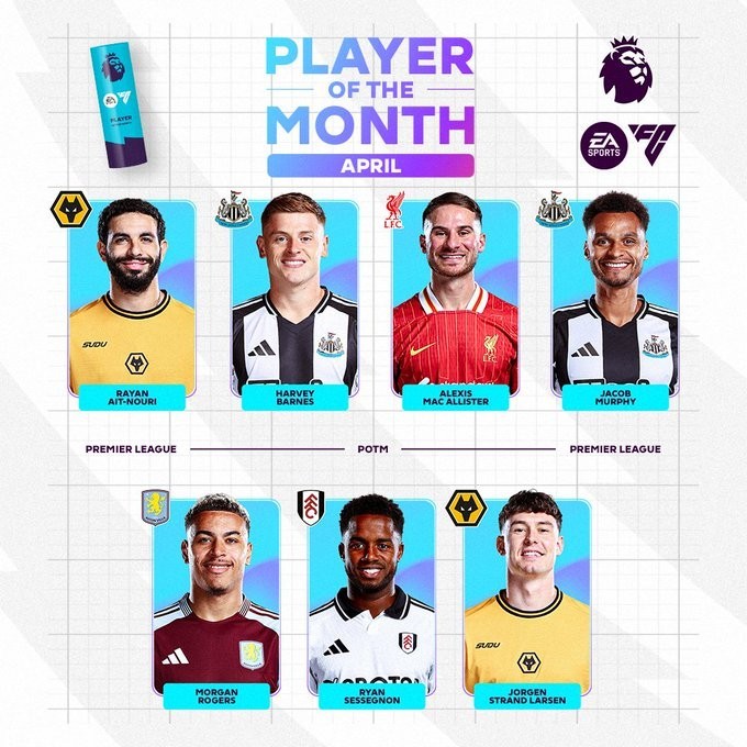 5月1日,英超官方公布了4月份最佳球员候选名单,分别是麦卡利斯特、哈维-巴恩斯、尤尔根-拉森、艾特-努里、雅各布-墨菲、摩根-罗杰斯、塞塞尼翁。