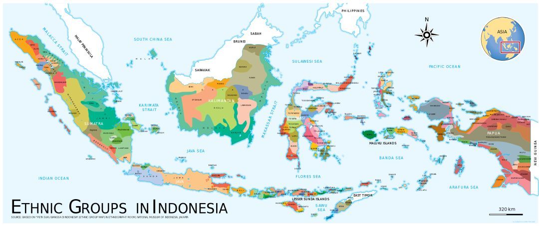 印度尼西亚是世界上最大的群岛国家,大小岛屿散布在印度洋与太平洋之间,尤为壮观,因而号称“万岛之国”。由于国土被汪洋大海阻隔得支离破碎,因此印度尼西亚全国各地形成了一百余个的不同人口种群,并随着种群的分化而产生了多达两百多种以上的不同语言。
