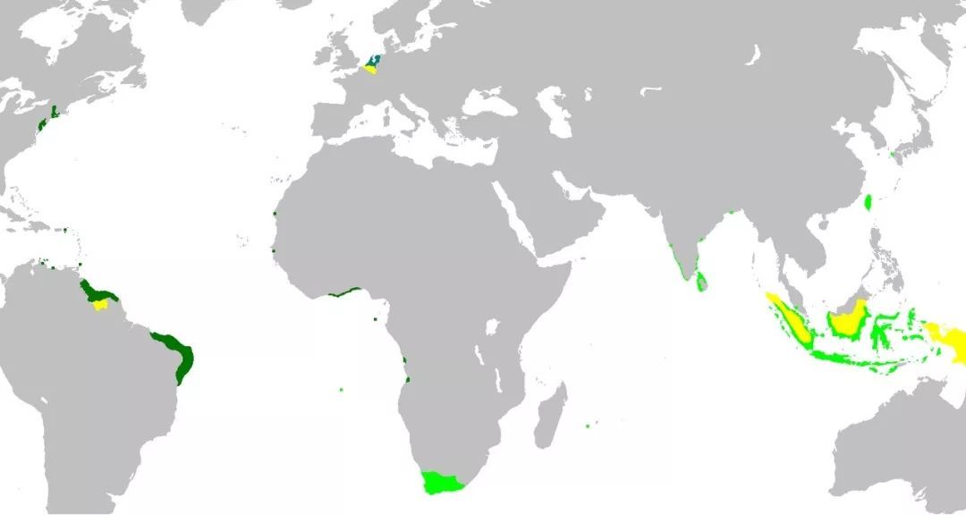 ▲荷兰殖民版图(深绿色为荷兰西印度公司所辖,浅绿色为荷兰东印度公司所辖)