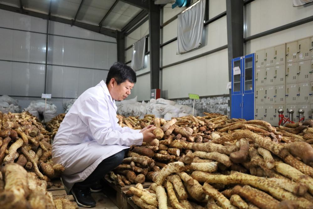 企业工作人员查看刚刚采收的肉苁蓉。新华社记者李云平 摄