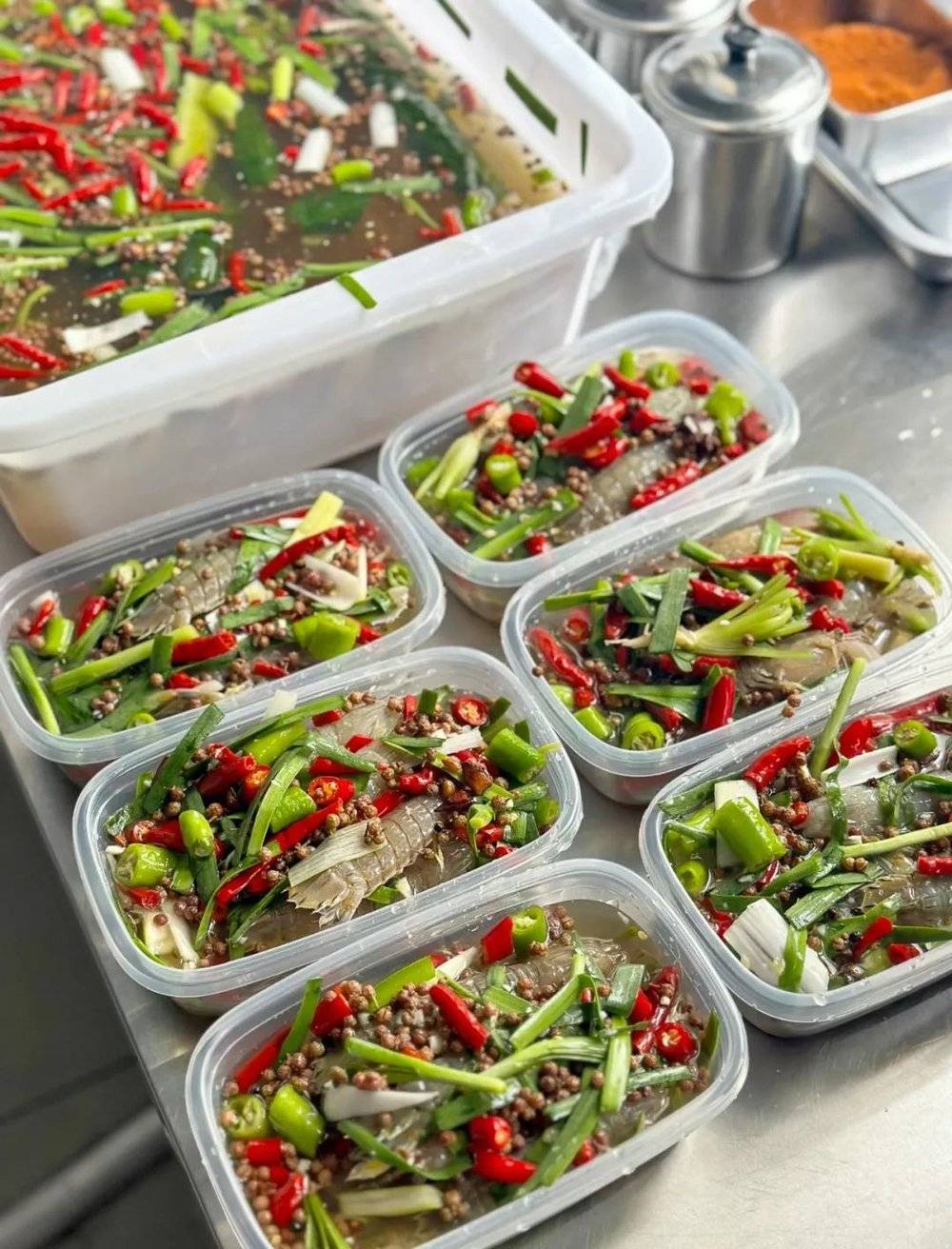 其实在营口,“生腌”更本地的叫法是咸货。我们去的农贸市场叫建丰市场,那里有很多咸货摊位,几乎每个摊位都在自己的白色长形塑料盆里摆满了咸虾咸蟹。不同于潮汕生腌,营口咸货在激烈的竞争环境里,催生了干腌、湿腌两种腌制方法。干腌几乎不用卤水,虾蟹贝类裹满盐粒,湿腌大部分为白卤,花椒、大料、香菜、辣椒圈浮于卤水表面—— 至于外地流行的什么泰式柠檬,酸辣百香果,几乎完全不存在,但是有的店会参考盘锦河蟹的腌制方法,添加黄瓜条或黄瓜片。