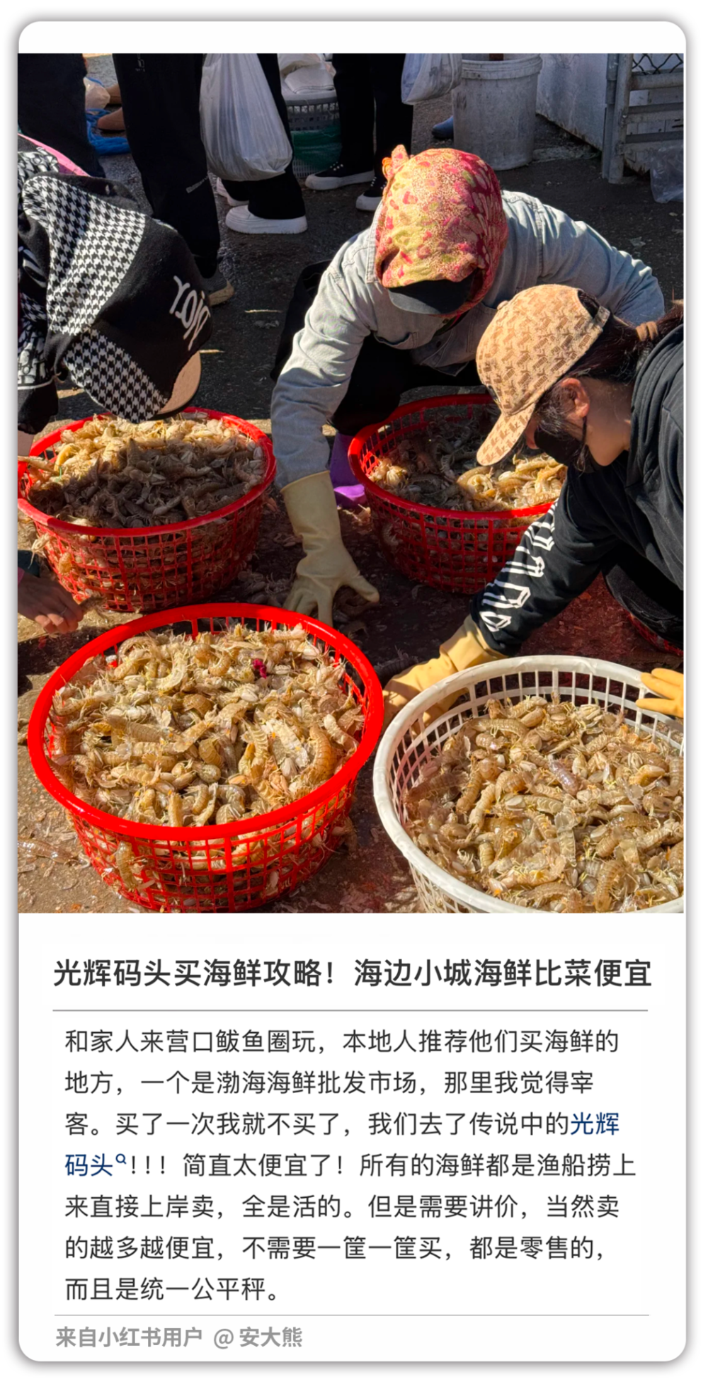 小薇发誓,这次务必要让我们几个东北内陆人,彻底领略咱东北大海的“海大物博”。为此她甚至做了一个PPT,小标题和图片一应俱全:去光辉码头买海鲜,去农贸市场采购生腌,以及参与营口人的一项4月盛会:抓骚夹子。