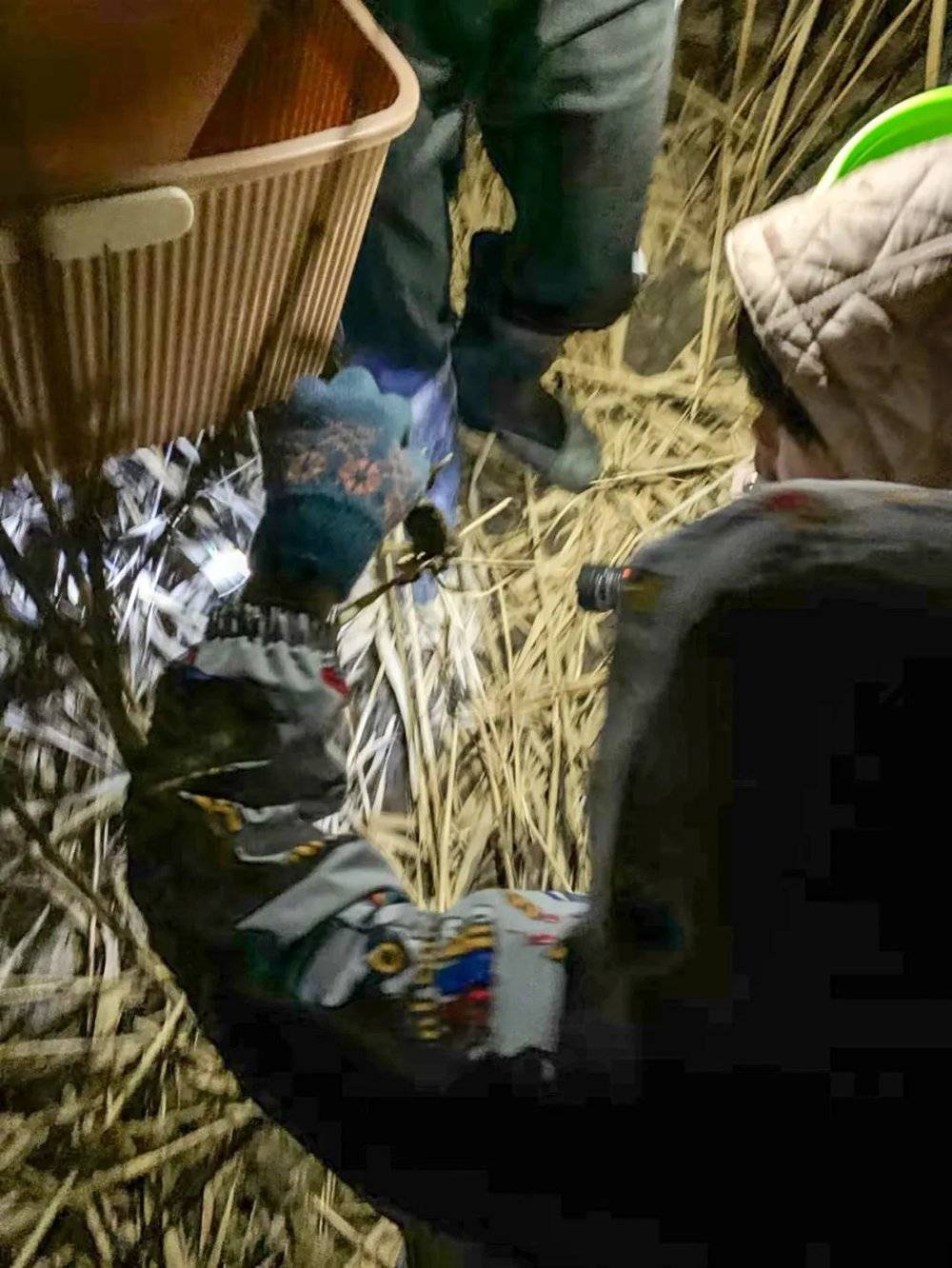 西炮台的芦苇滩,公路两侧大大小小的车辆排成直线,人声喧哗,手电筒灯光点点,恍若午夜派对。更有人盛装出席——身穿越野套装,脚蹬胶皮雨靴,头上戴了更为专业的照明灯,提着大水桶左看右看。