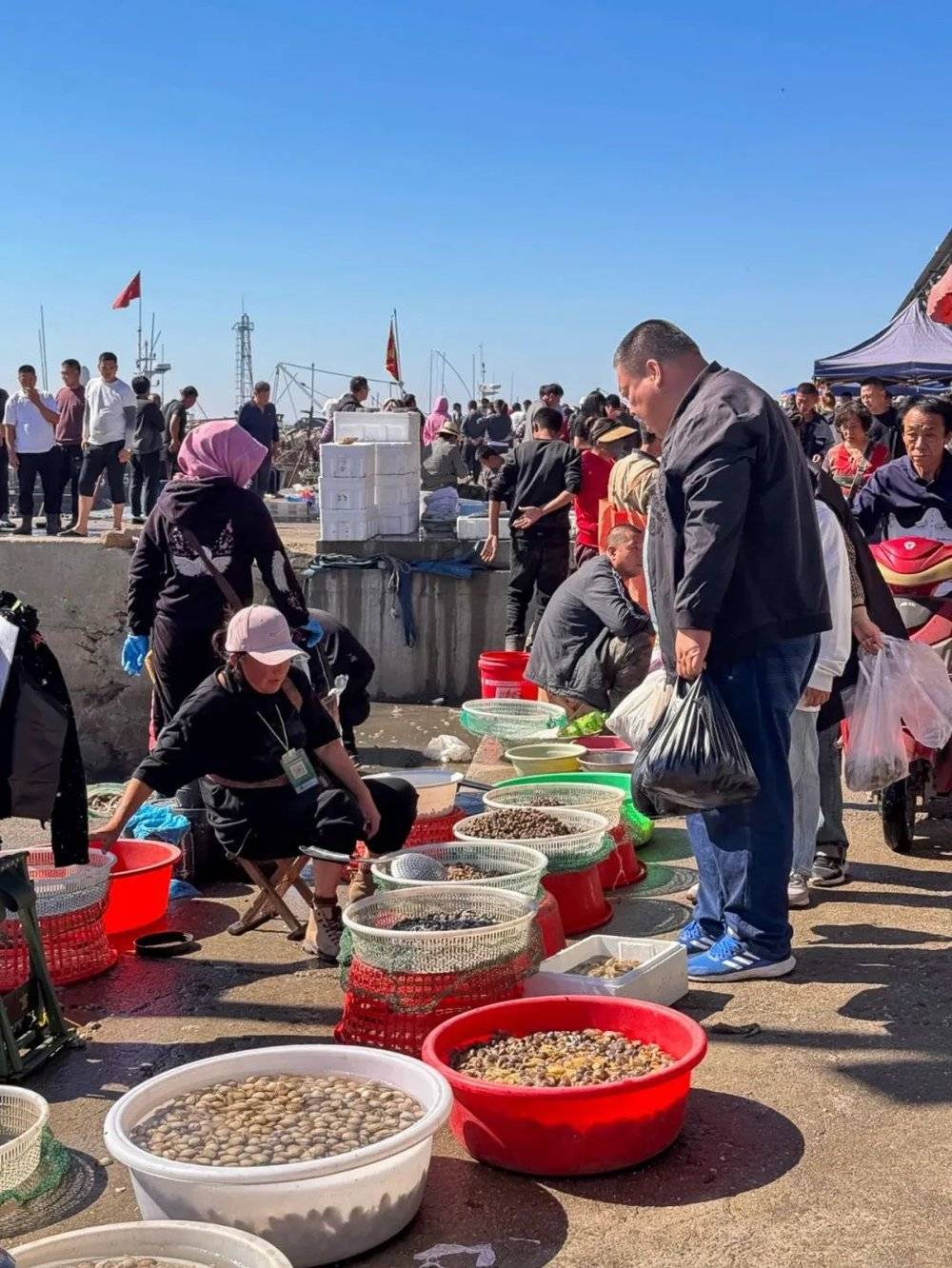 小薇说这种虾叫花虾,正应季,有的渔船只做批发,我们即使冲进去也有被拒的可能,只能寻找合适的卖家。她让我们站在原地,自己消失在人群中。等她回来,手里已经抓满了袋子,各个都有东西在动。最终为大家选购了虾爬子、海瓜子、巴鞘、花盖蟹、花虾、油扣(一种小海鱼)、白蚬子,以及准备带回去的咸干海鲶鱼。