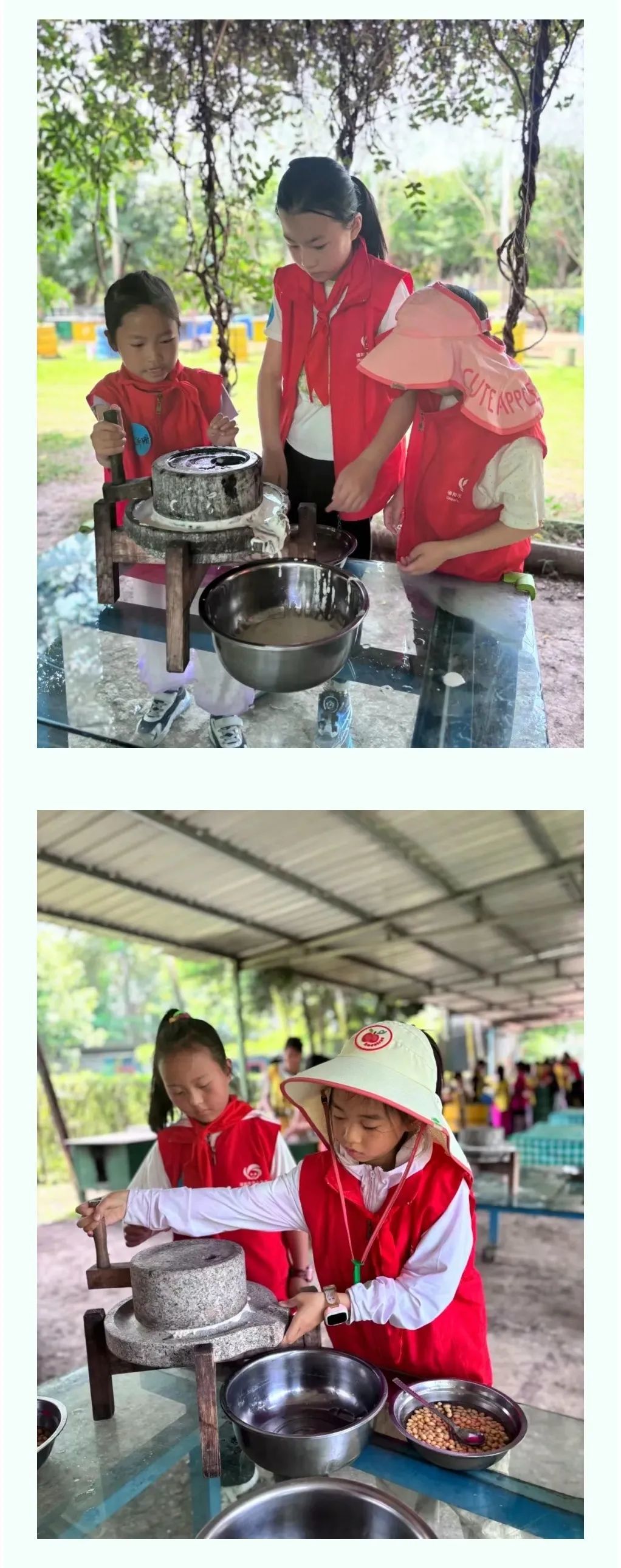 石磨滚滚,豆浆飘香。队员们在沉重的石磨上进行分工合作,各司其职,共同制作出一杯杯清香四溢的豆浆。传统古法制作豆浆,不仅让队员们了解了传统的技艺,也深刻感受了古代劳动人民的智慧与勤劳。