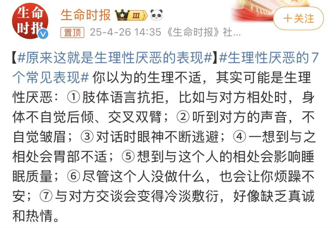 有心理学家解释说,出现这种情况,很有可能是你遭受过情感的PTSD,目前还没办法从其中走出来,于是便产生了生理性厌恶。
