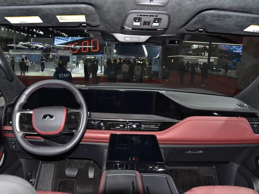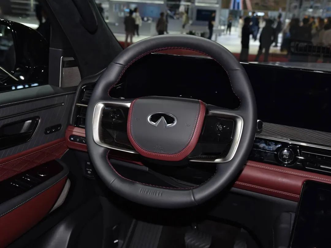 内饰方面,全新英菲尼迪QX80 Sensory车型提供黑色、米色、檀柏褐棕三种内饰风格,Autograph车型拥有专属勃艮第红内饰,并升级有Alcantara车顶内衬、方向盘INFINITI专属标识、琴弦式激光雕刻实木饰板以及车门扶手双色皮革设计。新车采用全新双14.3英寸显示屏布局,取消部分物理按键,并由中控台下部的9英寸多功能控制屏取代。