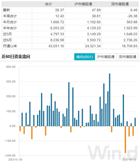 Wind数据显示,4月,南向资金累计净买入1666.72亿港元。4月9日单日净买入355.86亿港元,创港股通开通以来最高纪录。截至4月30日,今年以来南向资金累计流入6053.25亿港元。