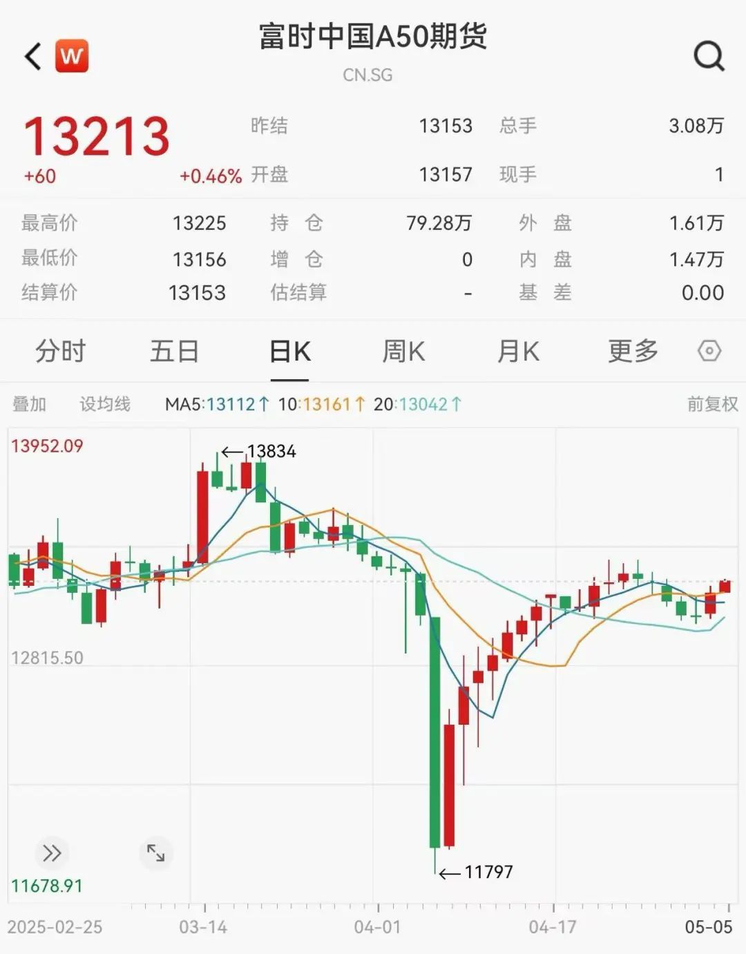 同时,富时中国A50期货止跌回升。截至5月2日收盘,富时中国A50期货上涨近0.5%。