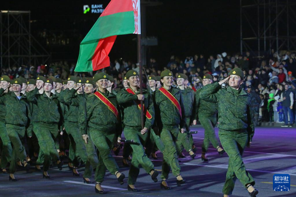 5月2日,在白俄罗斯首都明斯克,士兵列队参加纪念卫国战争胜利80周年阅兵式彩排。