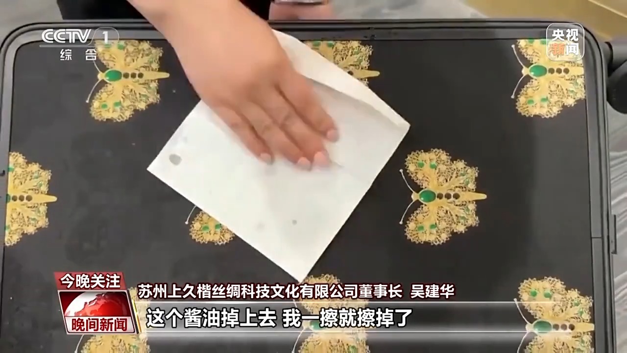 苏州上久楷丝绸科技文化有限公司董事长 吴建华:这个宋锦面料,经过一些特殊的三防处理,就是防水、防油污、防火。三防处理以后,矿泉水倒上去,酱油倒上去,一擦就擦掉了。