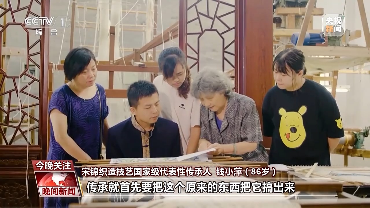 伴随着技术不断革新,传统宋锦织造从纹织技术到生产制造的众多工序都逐渐由机械化和计算机生产线来替代,钱小萍也把更多精力转向传承与创新。在她的工作室,中生代、00后正为宋锦注入新的活力。