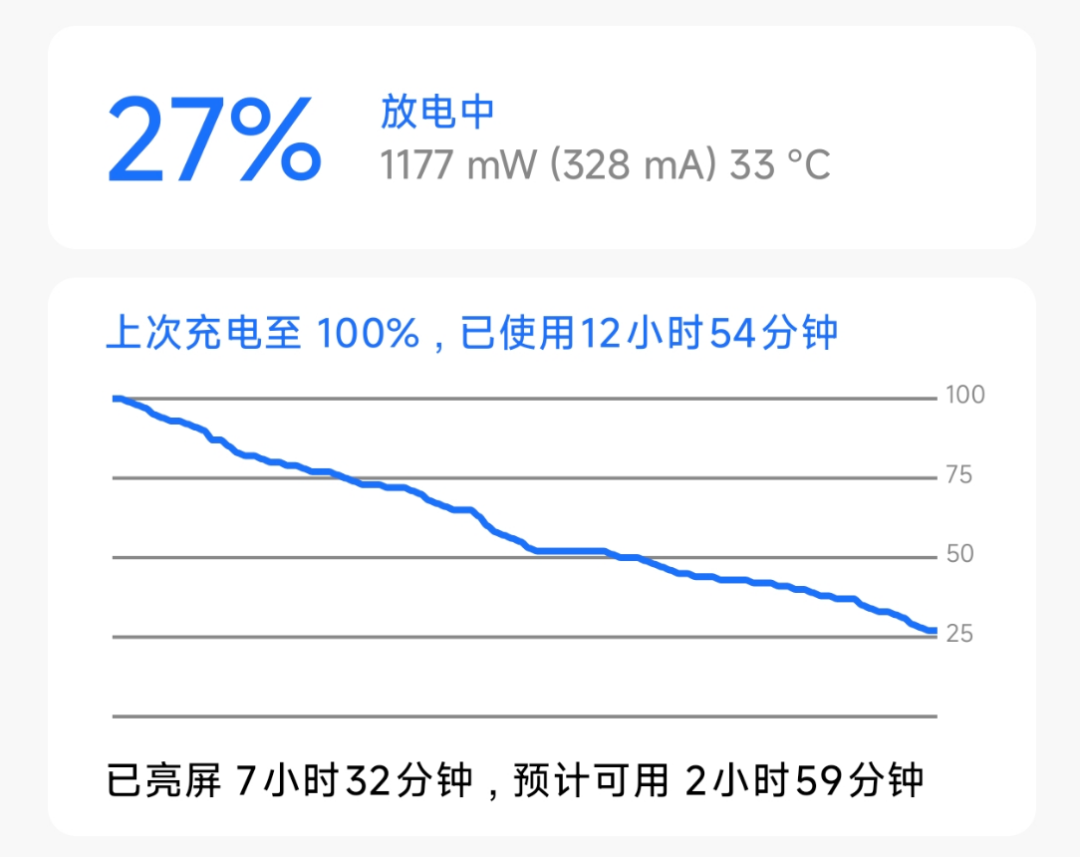 5G+WiFi 混合场景,一天高强度使用下来,七个半小时亮屏还剩下 27%。