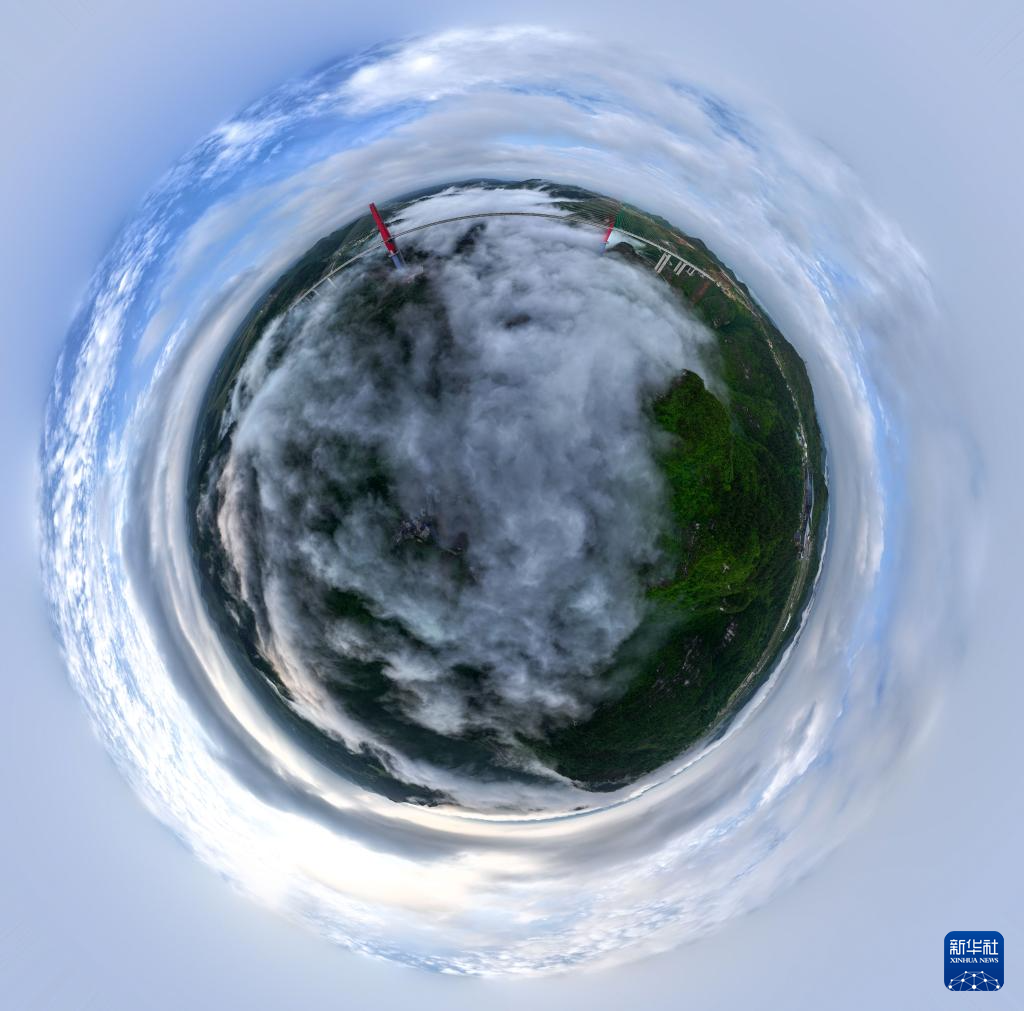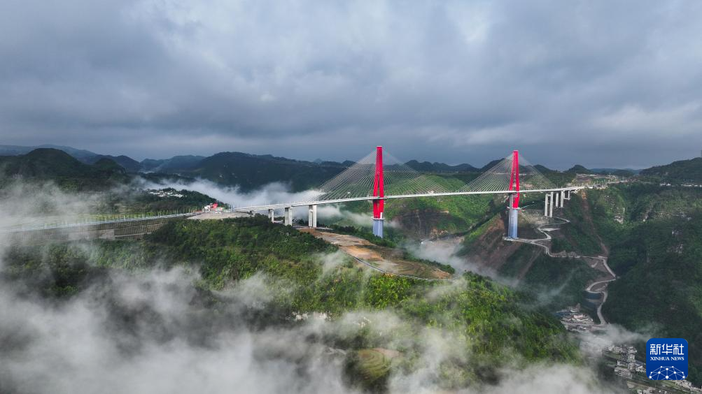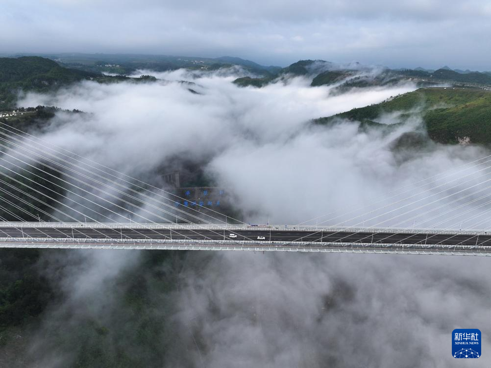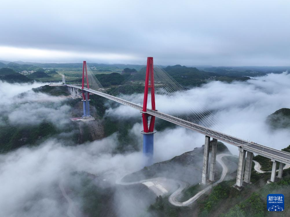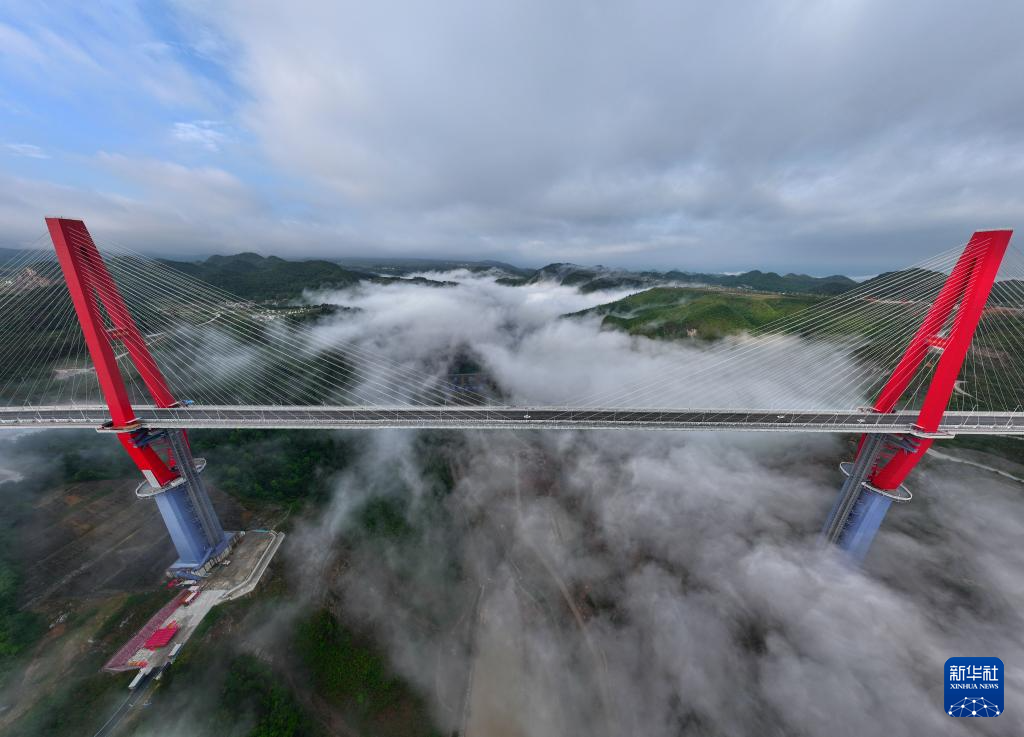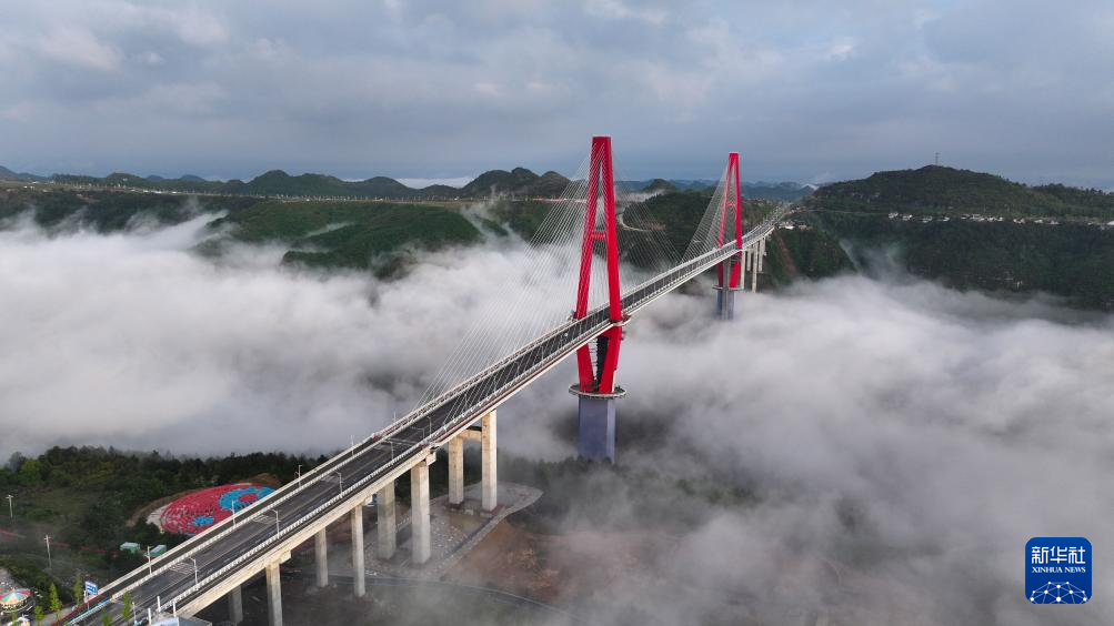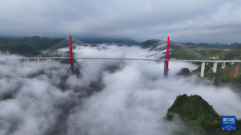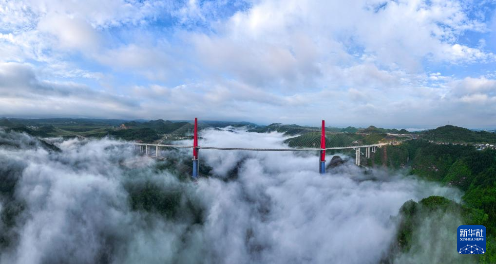当日,一场春雨过后,贵州省龙里县的龙里河大桥周边出现云海景观,晨曦中的大桥仿佛飞架于云端之上,蔚为壮观。龙里河大桥全长1260米,主桥及塔柱设计有观光旅游玻璃栈道、全景观光电梯等旅游设施,是贵州探索“桥旅融合”打造的新“网红”景点。