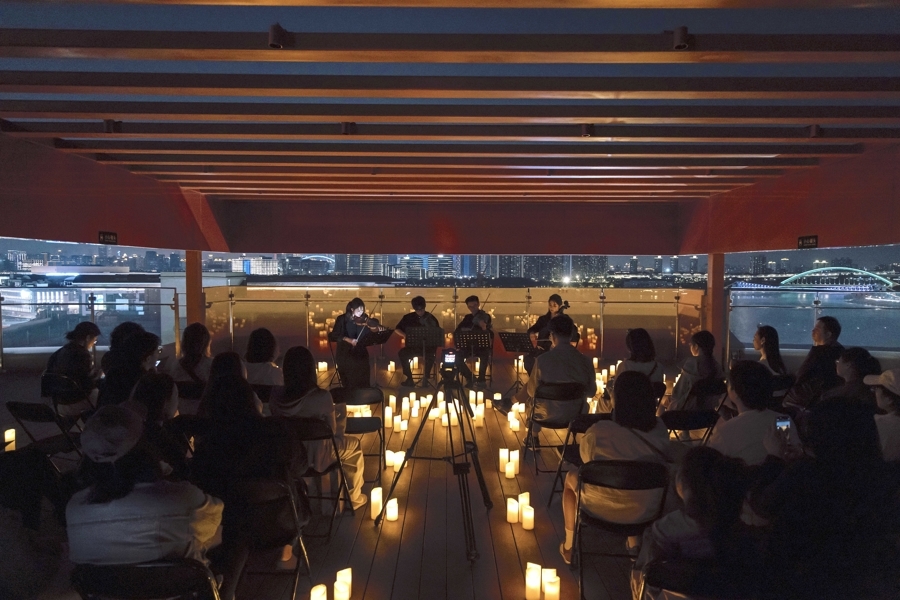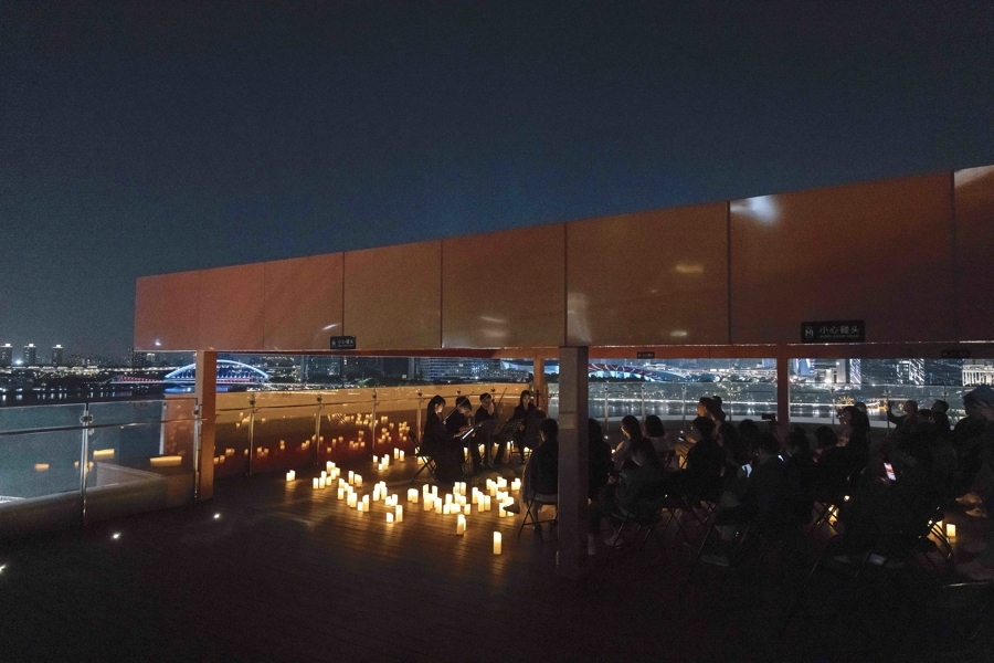 当暮色垂临,波光粼粼的江水与摇曳的烛光在临江天台相遇,500枚蜡烛点缀的江畔露台在夕阳与都市霓虹的交织下别有韵味。当“一步之遥”的小提琴声扬起,烛光映衬着江岸的建筑剪影,西岸独特的工业美学与自然韵律使其更显城市“微度假”目的地的特质。