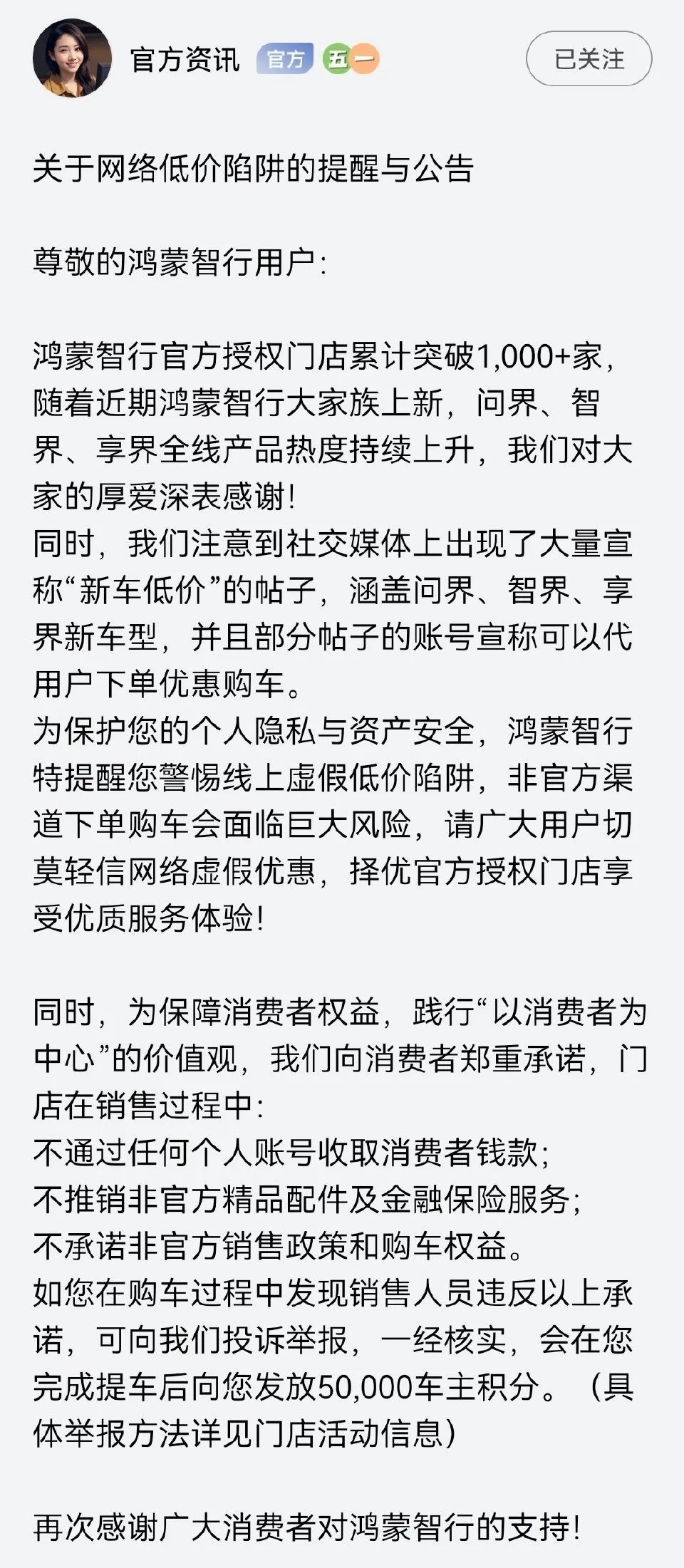 5月2日,鸿蒙智行在其官方App发布《关于网络低价陷阱的提醒与公告》。公告内容提醒用户警惕社交媒体上出现的“新车低价”帖子,这些帖子涉及问界、智界、享界新车型,且这些帖子宣称可以代用户下单优惠购车。