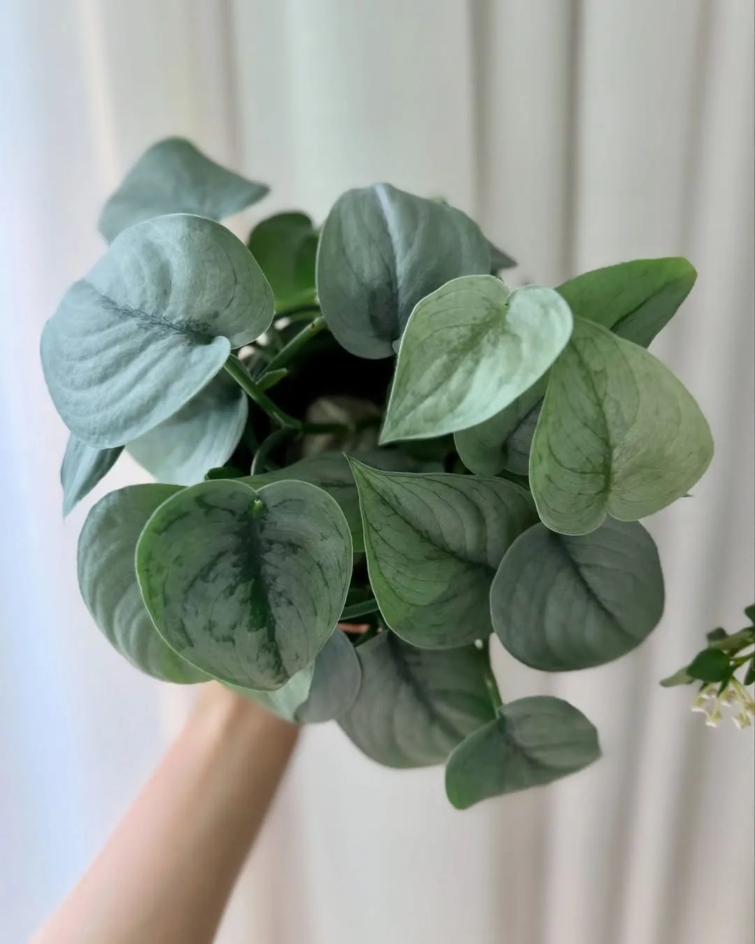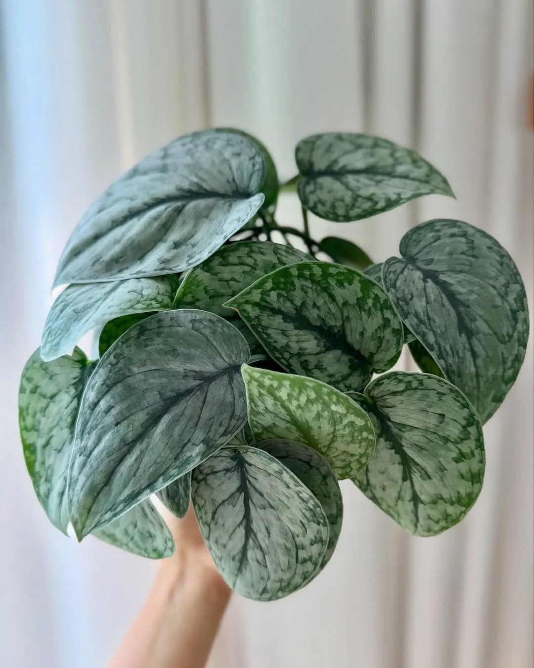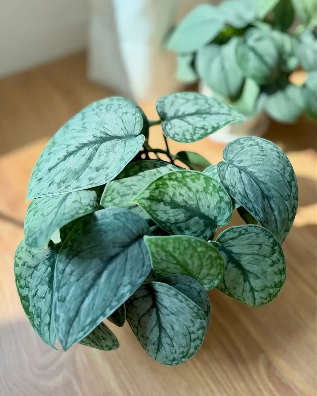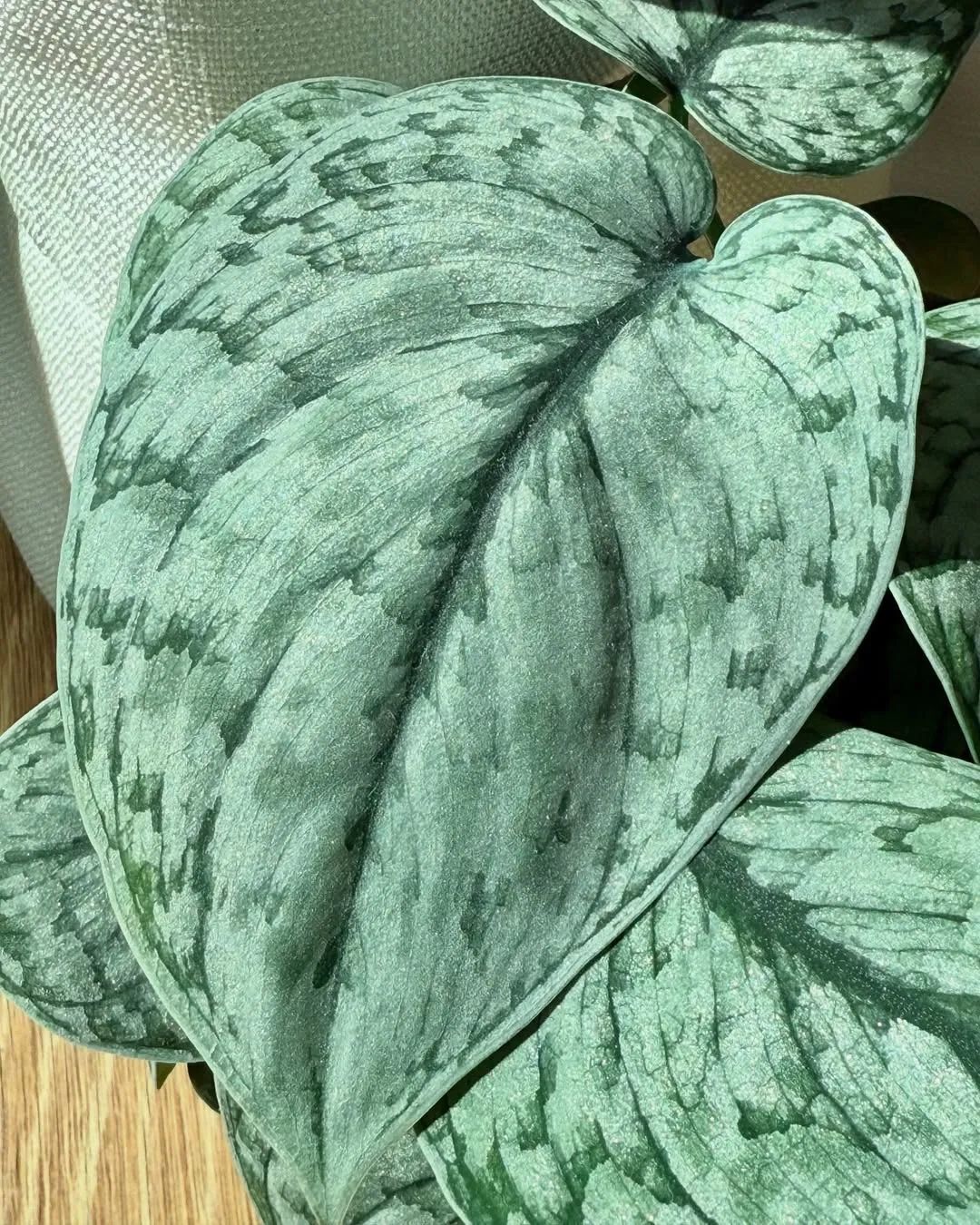 大叶银斑葛的叶子呈银绿色斑驳状,极具高级感,是近年来流行的室内观叶植物。它皮实耐养,可水培或土培,垂盆生长时观赏性极佳,有特别多园艺品种可选。