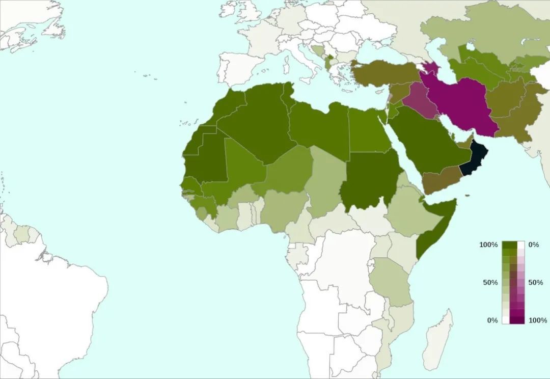 ▲中东和非洲的什叶派分布(紫色)