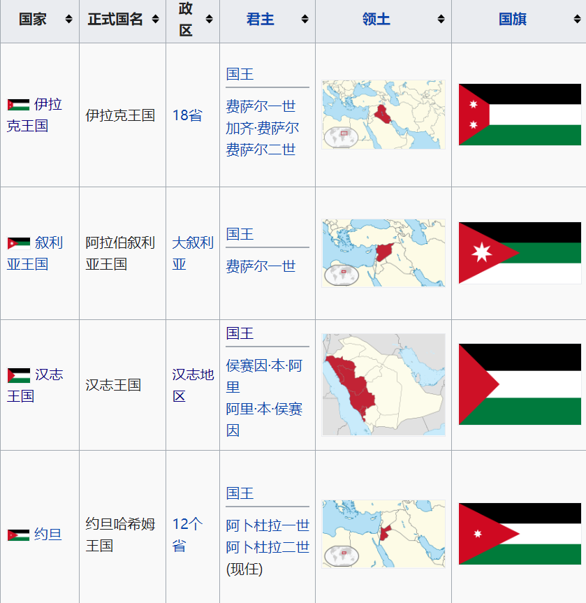 一战之后,原汉志国王侯赛因·伊本·阿里派几个儿子率军去收复叙利亚,但是叙利亚已被法军占领。在英国的调和下,第二子阿卜杜拉放弃与法国争夺叙利亚,在英国和约旦人的支持下成为约旦国王。第三子费萨尔被叙利亚人拥立为叙利亚国王,但是最后被法国驱逐,英国遂扶植其为伊拉克国王。