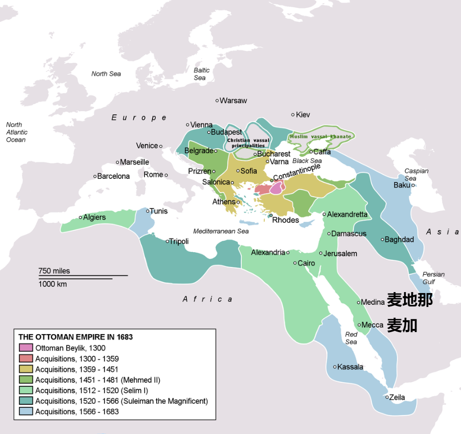 ▲奥斯曼帝国时期,领土涵盖了麦加和麦地那