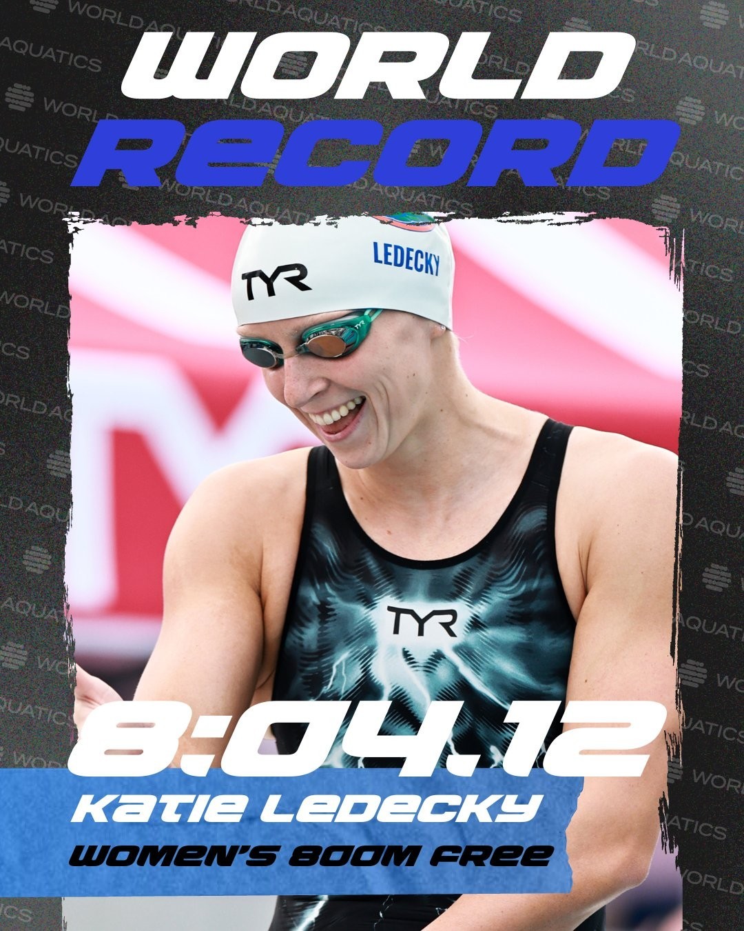 莱德基在28岁年纪打破了19岁时候游出的世界纪录,当时她在里约游出8分04秒79。