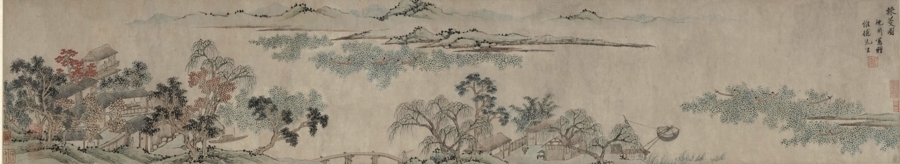 陆游写有《初夏怀故山》一诗,描写了自己对故乡生活的思念。诗云:“镜湖四月正清和,白塔红桥小艇过。梅雨晴时插秧鼓,苹风生处采菱歌。沉迷簿领吟哦少,淹泊蛮荒感慨多。谁谓吾庐六千里,眼中历历见渔蓑。”这首七律以镜湖的初夏风光为背景,将田园之乐与宦游之苦交织对照,展现出诗人复杂的情绪。“镜湖四月正清和”点明时间地点,用“清和”一词来形容此时惬意的自然环境。“白塔红桥小艇过”描绘出一幅流动的画卷,青色小艇穿过红桥,与远处的白塔交映成趣,宛如南宋的院体小品绘画。颔联聚焦于农事活动,“梅雨晴时插秧鼓”从听觉的角度写鼓声催更,田野大地上一派繁忙景象。“苹风生处采菱歌”则从听觉和触觉的角度,描写风中传来的采菱歌声。这一句非常巧妙,并未正面描写女子于小艇上采菱的忙碌身影,而仅仅描写风中欢快的歌声,带给读者无尽的联想。颈联中诗人开始感叹自己公务的繁忙,看似诗中在抱怨文书劳形,实际上也是“位卑未敢忘忧国”(《病起书怀》)的变相表达。