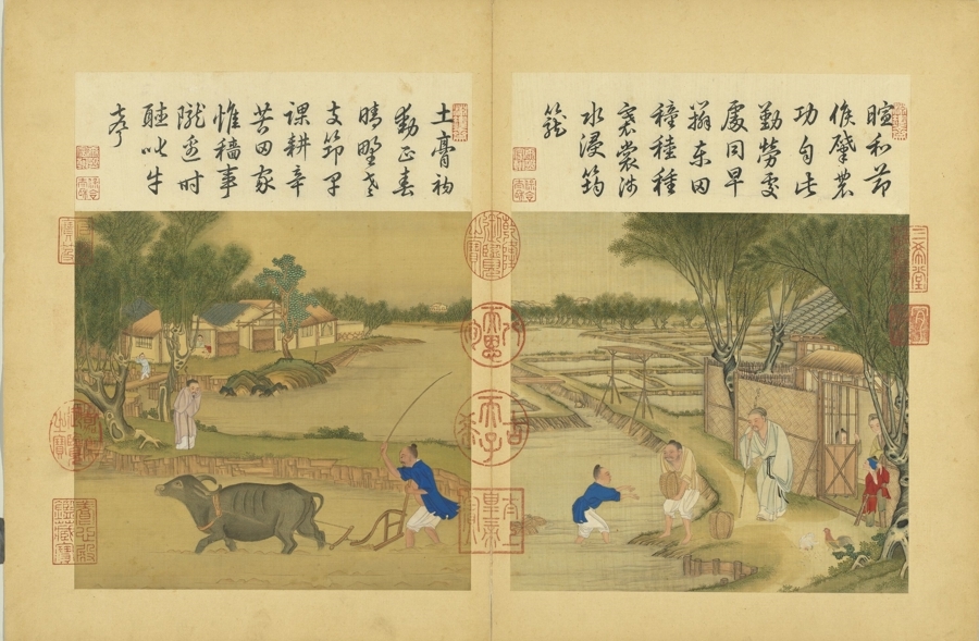 忙完蚕事,农民也没有休息的时间,因为还有许多工作在等着他们。宋代翁卷在名作《乡村四月》中写道:“绿遍山原白满川,子规声里雨如烟。乡村四月闲人少,才了蚕桑又插田。”这首诗以清新明快的风格描绘出江南初夏时节美丽的自然风光和农人们繁忙的农事活动。“绿遍山原”中的“遍”字非常传神地写出初夏时分绿意的浩浩荡荡、铺天盖地,植物拔节生长,生命热烈蓊郁。“白满川”描写水光映天的场景,此时正值梅雨季节,降水增多,河塘里的水量变大。“子规声里雨如烟”以烟喻雨,呈现出梅雨季节烟雾浩渺、云烟飘荡的气象,子规的啼叫似在催更,也增添了无限生机。后两句描写农家四月农事繁忙的景象。一个“才”一个“又”富有表现力,虽不言忙而忙意自现。