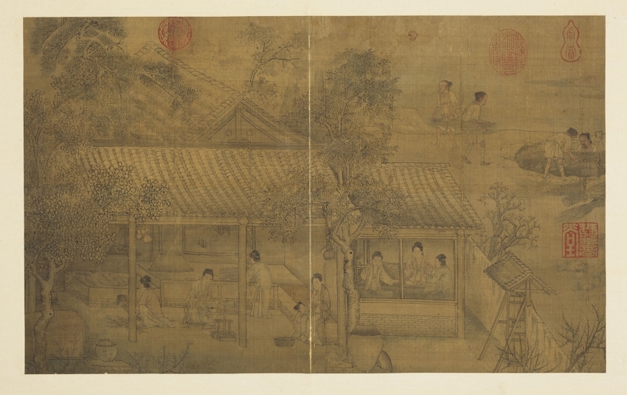 初夏时节农事繁忙,农人们穿梭于田间地头辛勤劳作,田里的庄稼也正肆意生长。元代诗人白珽写有五言律诗《余杭四月》,描绘出四月杭州的乡村风俗。诗云:“四月余杭道,一晴生意繁。朱樱青豆酒,绿草白鹅村。水满船头滑,风轻袖影翻。几家蚕事动,寂寂昼关门。”农历四月的杭州,万物茁壮成长,一派勃勃生机。樱桃红艳欲滴,青豆配着美酒,爽口宜人。村头田间满眼绿色,白鹅在青草绿水间嬉戏。朱、青、绿、白,饱和度极高的颜色明丽宜人,组成了初夏时节美丽的田园画卷。最后一句将描写的重点转向人们繁忙的劳动。此时家家户户都忙着养蚕,为了防止外人冲犯,都紧闭门户。“寂寂”两个字写出街道庭院中的安静,反衬出屋内蚕事活动的繁忙。全诗不见人影,却处处可见人的活动,写出初夏时节人们的繁忙。