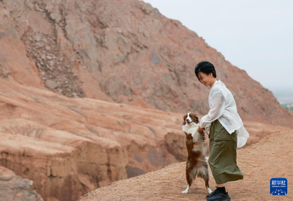 5月4日,一名携带宠物的游客在位于新疆吐鲁番市鄯善县的吐峪沟大峡谷游玩。