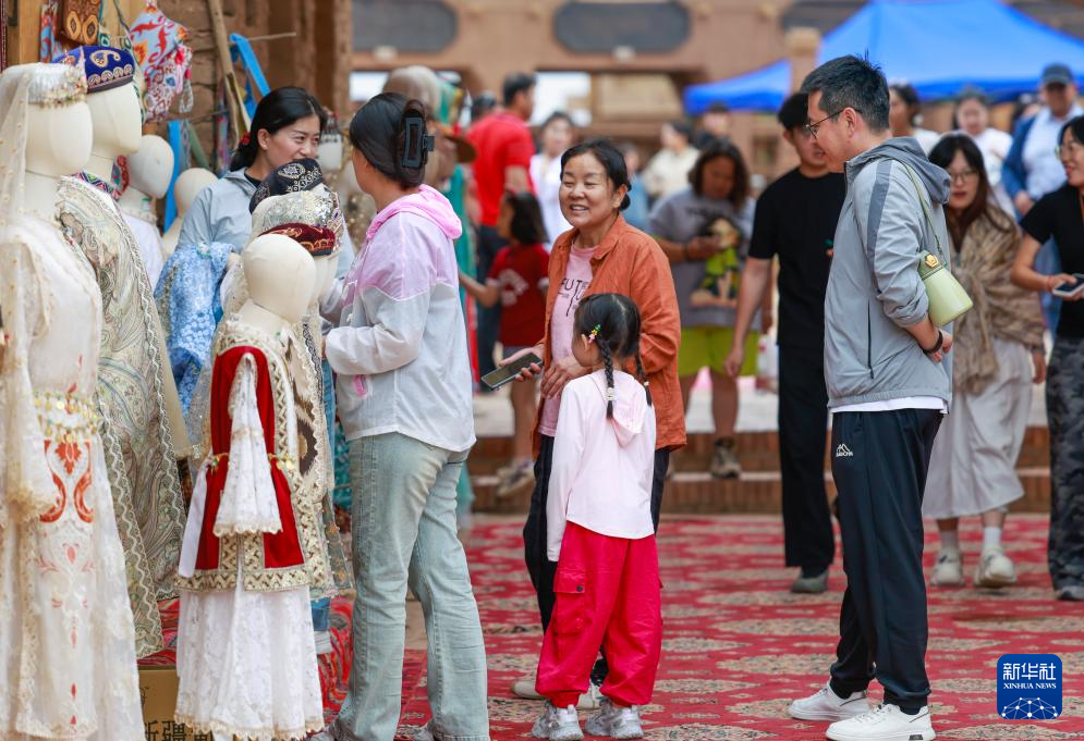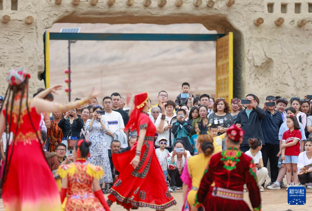 5月4日,游客在新疆吐鲁番市鄯善县吐峪沟景区欣赏民族歌舞表演。