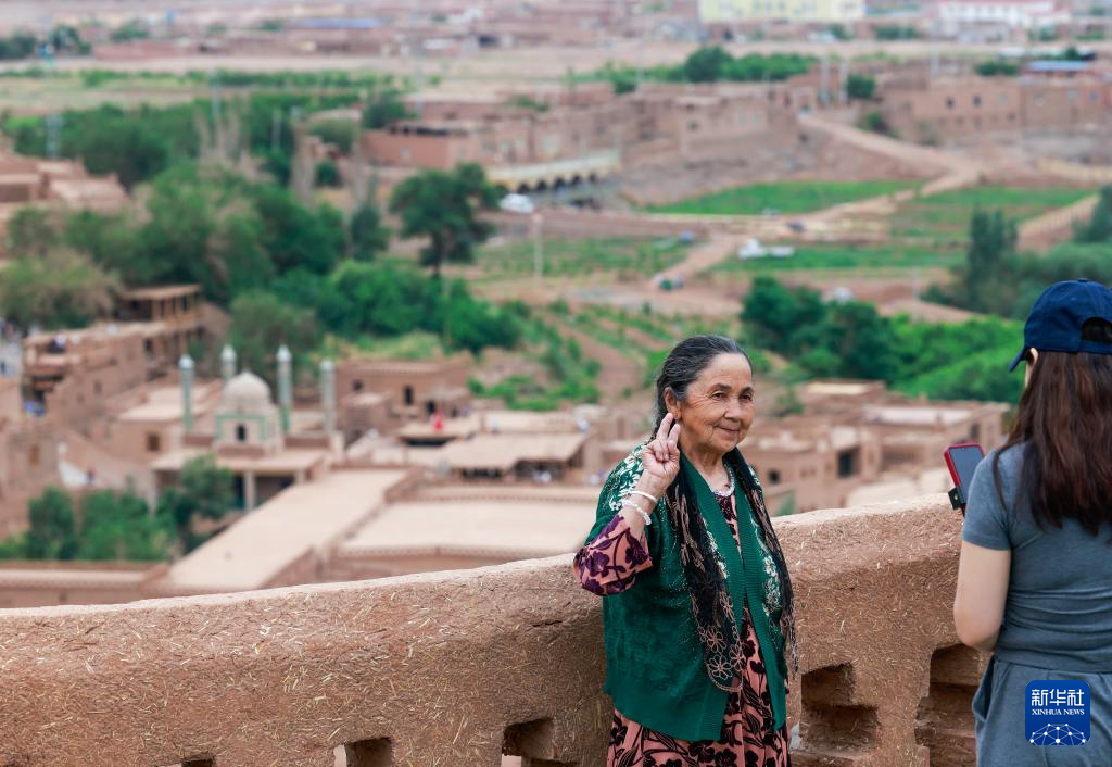 5月4日,游客在新疆吐鲁番市鄯善县吐峪沟景区附近的观景平台拍照留影。