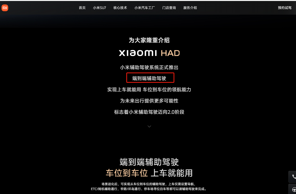 小米汽车官网介绍称,端到端辅助驾驶可实现从车位到车位的辅助驾驶,上车仅需设置导航,ETC/闸机辅助通行,窄路/环岛通行、停车场寻位泊车等都可以请辅助驾驶来完成。