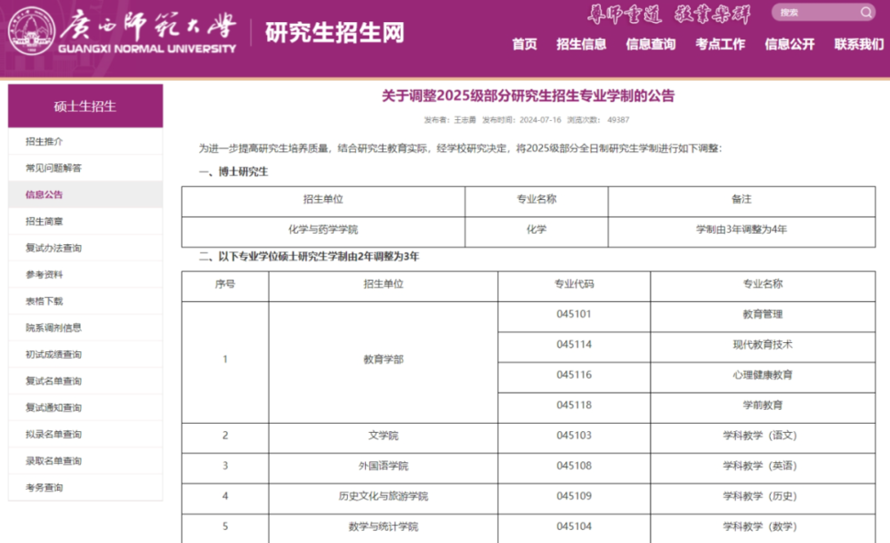 广西师范大学2024年7月发布公告称:将2025级的17个专业学位硕士研究生学制由2年调整为3年。同样,内蒙古师范大学自2025级硕士研究生起,将12个专硕学制延长至3年;沈阳理工大学超20个专业学位硕士研究生原来的学制是2.5年,现已全部改为3年。
