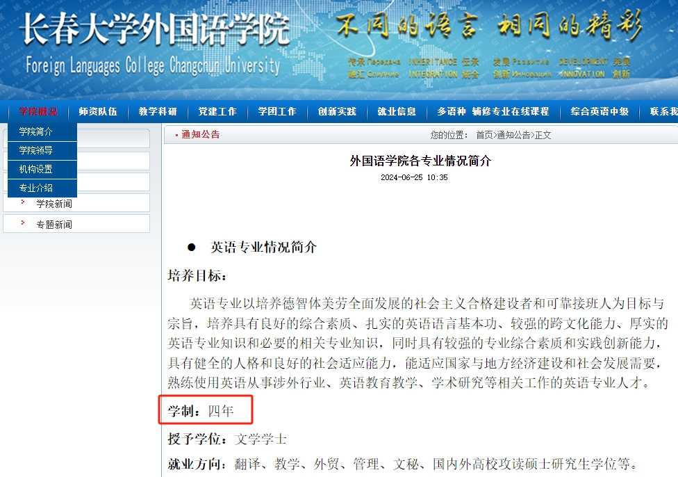 2024年6月,长春大学英语专业简介显示学制为四年。