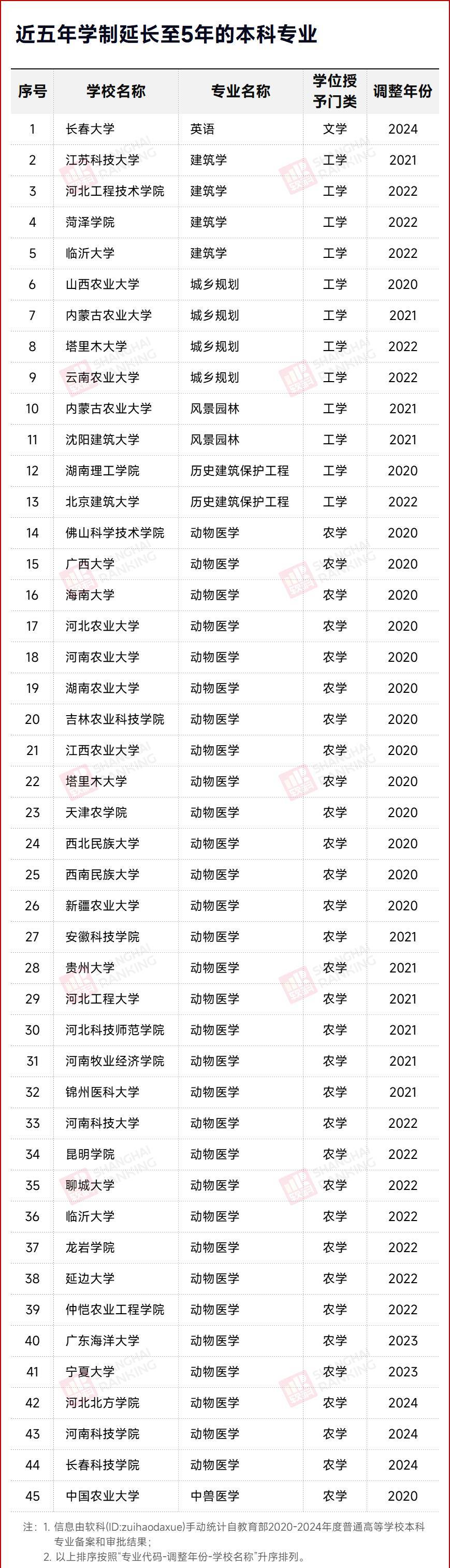 软科梳理了2020~2024年度的普通高等学校本科专业备案和审批结果,发现共有42所高校,将7个本科专业的学制延长至5年,涉及的专业为英语、建筑学、城乡规划、风景园林、历史建筑保护工程、动物医学、中兽医学。
