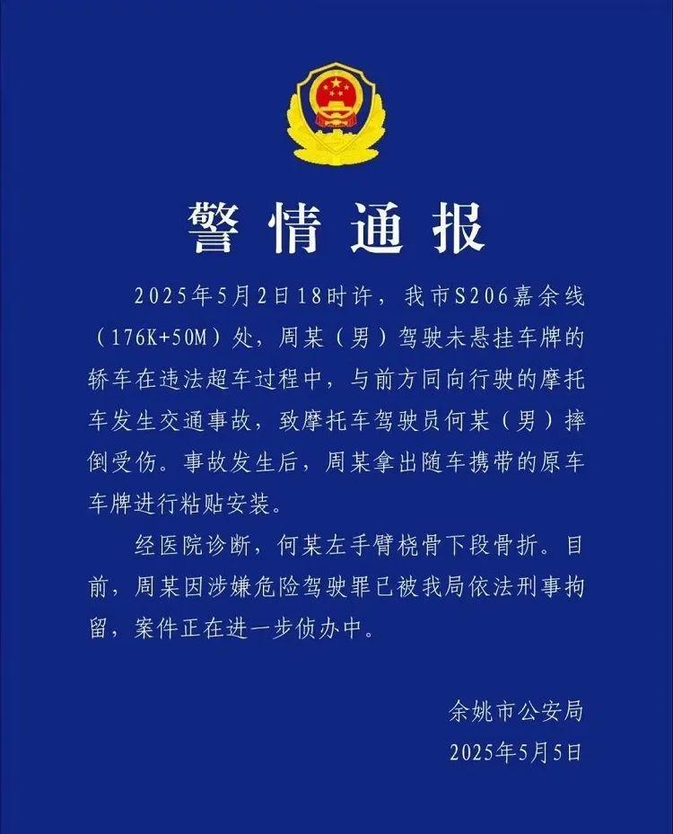 一天后,浙江余姚官方发布了警情通报,驾驶保时捷的周某因涉嫌危险驾驶罪,已经被依法刑事拘留。而摩托车驾驶员何某虽然在事故中看起来凶多吉少,但事实上只是左手臂桡骨下段骨折,没有生命危险。